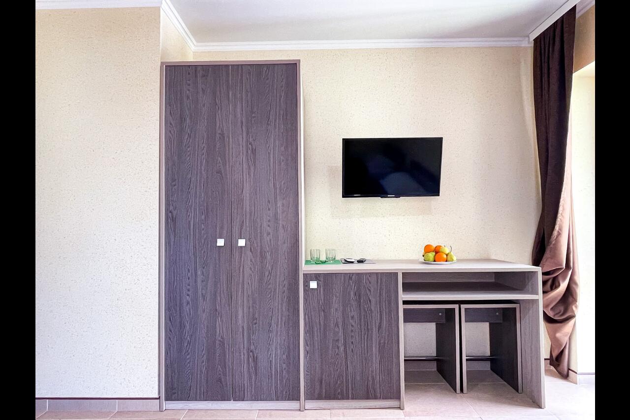 Номерной фонд прекрасен. Состоит из просторных современных номеров со всеми удобствами и балконами в каждом из них. Во дворе большой теплый бассейн с шезлонгами и беседками. В отеле работает собственная столовая, меню которой в значительной степени адаптировано для детского питания. Это добровольная опция, предварительный заказ не требуется.