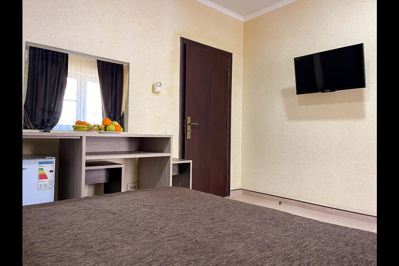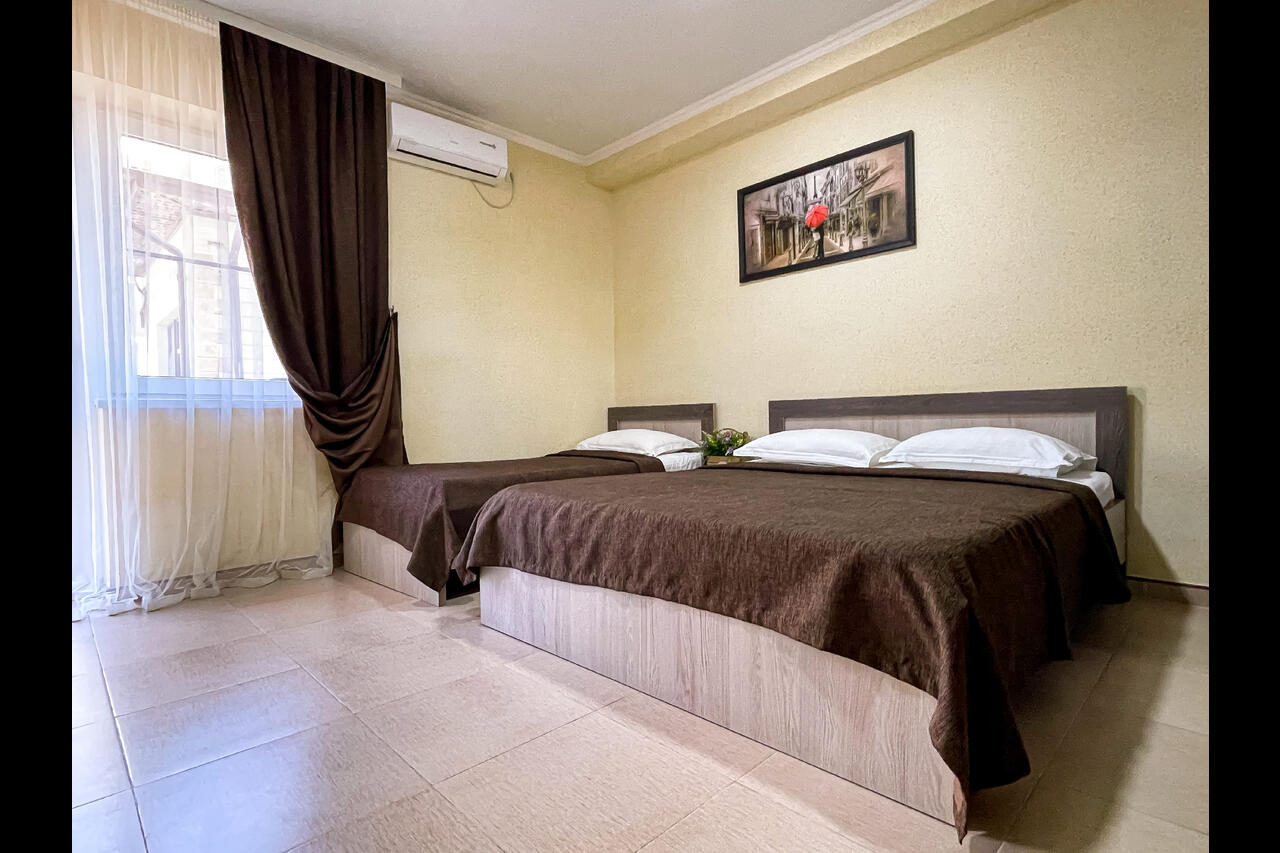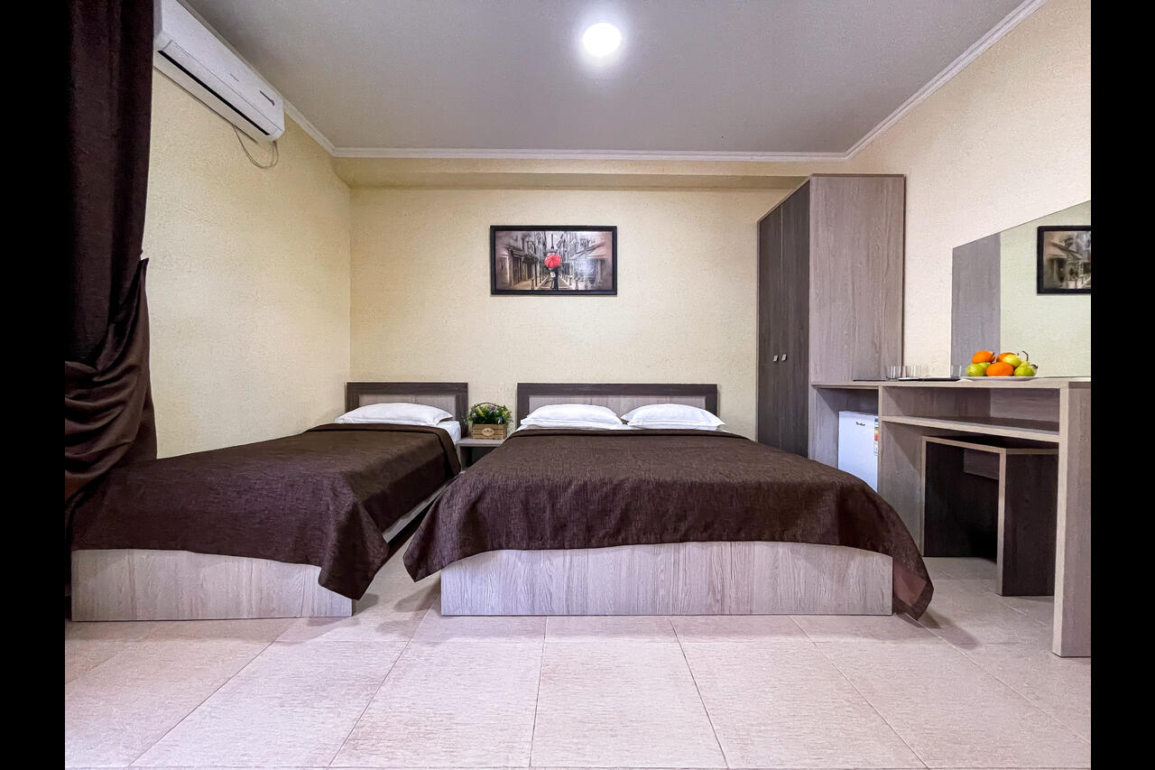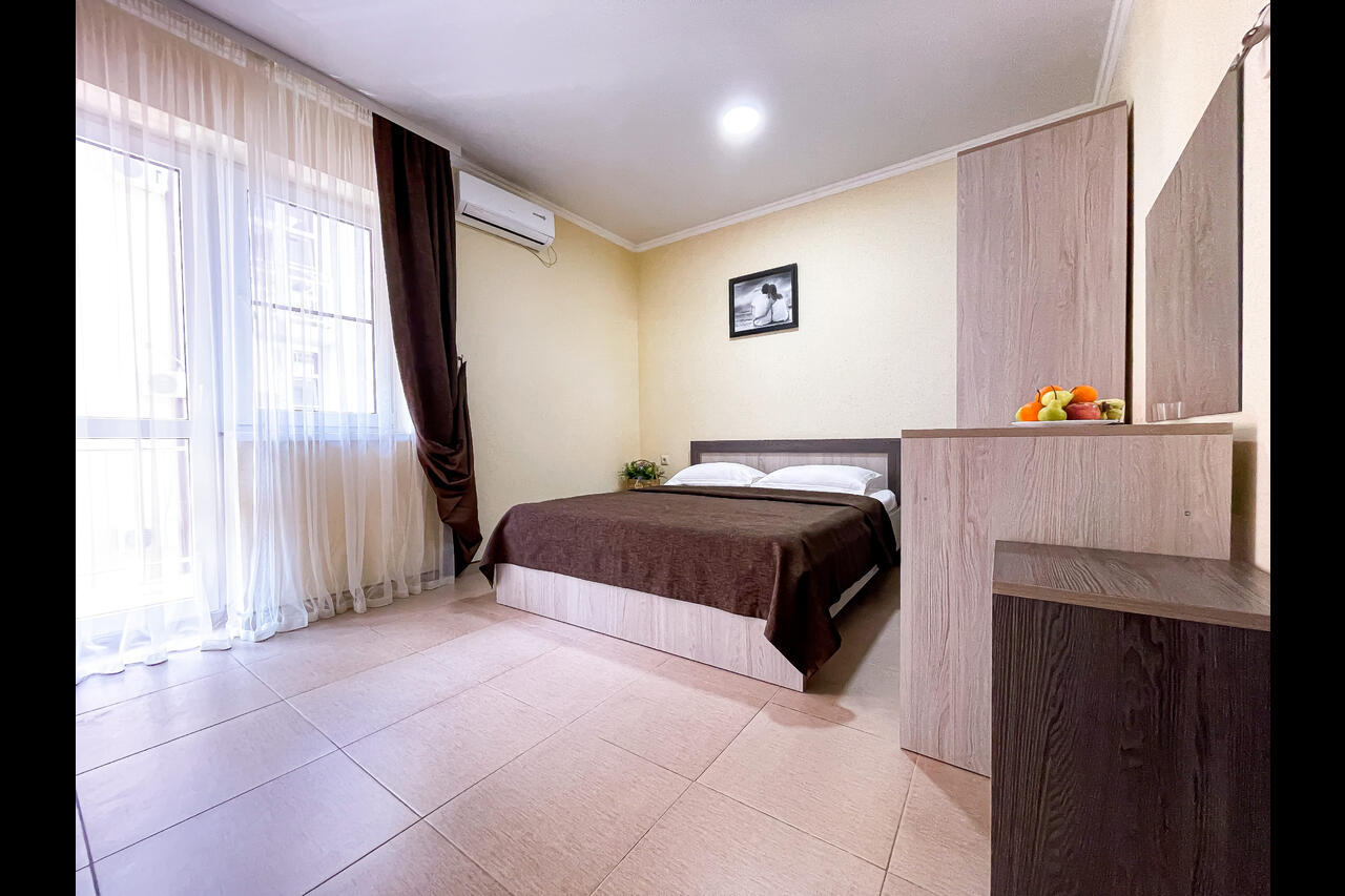 Новые современные номера с балконами. Стоимость номеров никак не зависит от количества человек. Дополнительные места еврораскладушки или детские кроватки, стульчики для кормления, ванночки и горшки предоставляются бесплатно.