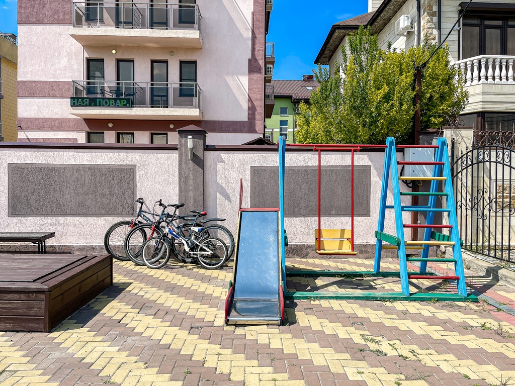 В стоимость входит: проживание в номере любого количества гостей в пределах его вместимости, предоставление допмест, периодическая уборка и смена белья, пользование бассейном и шезлонгами, зонами отдыха на территории, анимационные программы, детская площадка, батут, детские кроватки, коляски, стульчики для кормления, ванночки, горшки и т.п., самокаты, велосипеды, встреча на ЖД вокзале Анапы.